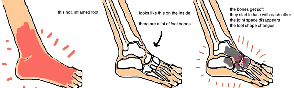Charcot arthropathy, also called charcot foot, is often found in persons with nerve damage and diabetes because nerve damage doesn't allow for the feeling of foot pain. Charcot foot disorder is a medical condition that leads to weakening of the bones in the foot. Patients may experience fractures and dislocations of bones and joints with minimal or no known trauma. Charcot foot is a progressive condition that involves the gradual weakening of bones, joints, and soft tissues of the foot or ankle. Nerves, bones, and joints neuropathic osteoarthropathy, or charcot foot, is an inflammatory process that affects the soft tissues, bones, and joints in the foot or ankle.